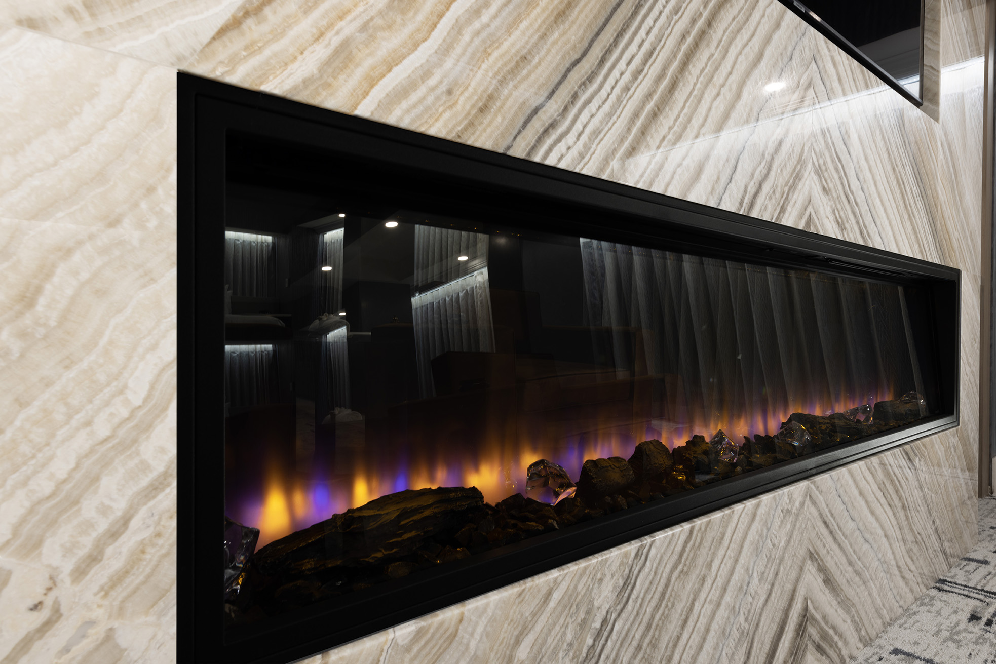 You'll find the perfect blend of comfort and luxury in Peppermill Reno’s newly-introduced Ember Suites. Marvel at the exquisite Bottacino stone flooring in both the entryway and bathroom. The centerpiece of the suite is a bespoke onyx fireplace with book-matched stone, complemented by a state-of-the-art LED electric fireplace. Experience entertainment at its finest with a 65" TV, artfully surrounded by custom-designed wall art and thoughtfully curated artifacts. Convenience is prioritized with an oversized fridge, and deluxe coffee setup, while motorized drapes ensure a seamless blend of style and functionality.